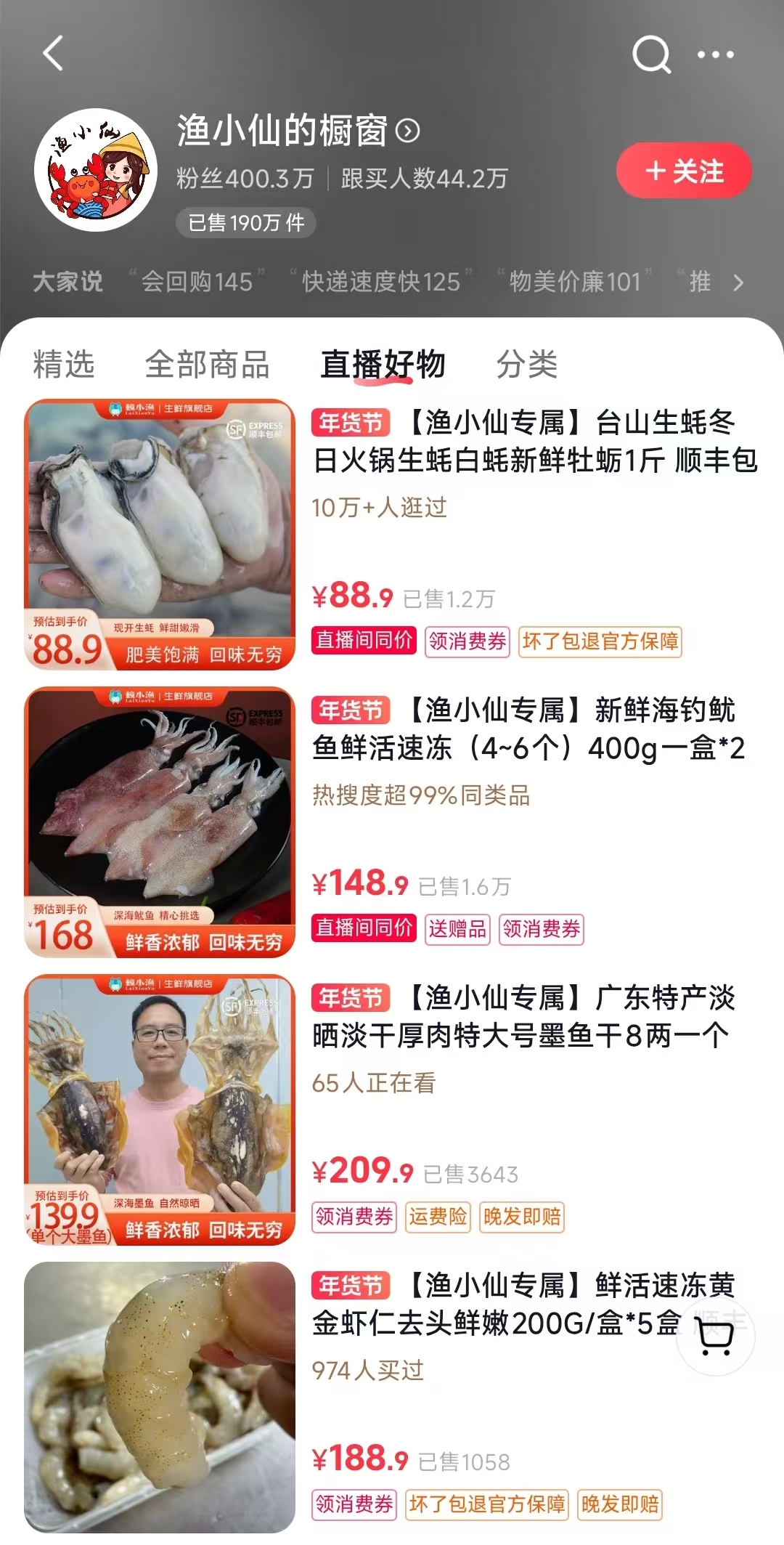 在广东,“渔小仙““德承行甄选滋补”“深圳非遗”等账号就为广东的家乡年货代言,助力“广货行天下”。南方+记者存在渔小仙直播间看到,来自广东台山的生蚝就受到不少网友的青睐,不仅吸引了超10万消费者的关注,更是取得了过万份的销量。而来自广东新鲜海钓的速冻鱿鱼,其热搜度更是超过了99%的同类商品,售出了超过1.6万件。此外,来自广东的特产淡晒墨鱼干、淡晒金鲳鱼、虾干等海鲜好货,同样成为了热销商品。“新疆也能买到,收到货非常好,闻着就很新鲜,期待第一次煲汤的味道!”有来自新疆的消费者,对墨鱼干这样的“广货”赞不绝口。