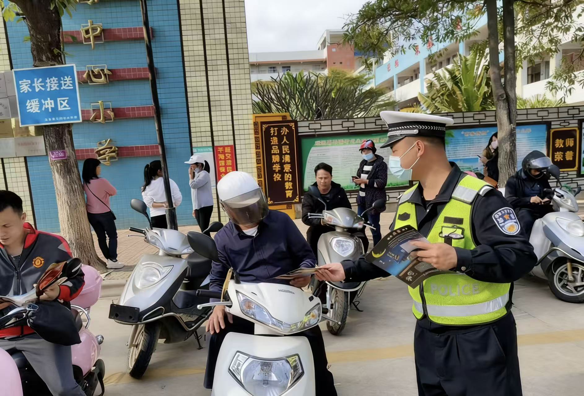 面对密集的接送车辆,警员一边疏导交通,引导车辆即停即走、避免拥堵,一边对乱穿马路、违规停放等行为进行劝导。期间,警员向等候的家长派发交通安全宣传单张,并结合单张内容耐心讲解“一盔一带”的重要性,提醒家长骑行接送时务必正确佩戴安全头盔,驾车时规范系好安全带,用通俗易懂的话语将安全知识传递给每位家长。